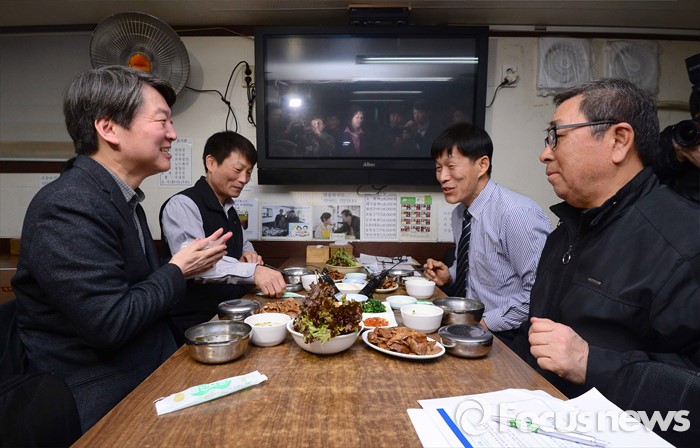 (서울=포커스뉴스) 15일 오후 서울 마포구 연남동 한 기사식당에서 안철수 국민의당 상임공동대표가 택시기사와 간담회를 갖고 있다.