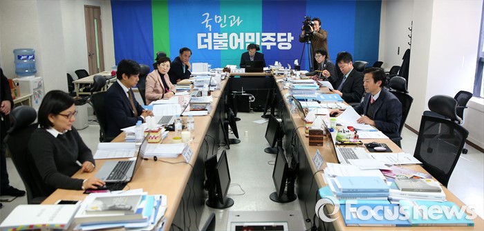 (서울=포커스뉴스) 홍창선 더불어민주당 공천관리위원장을 비롯한 위원들이 15일 오전 서울 여의도 당사에서 20대 총선 비례대표 후보 면접 심사를 하고 있다.