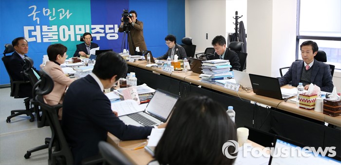 (서울=포커스뉴스) 홍창선 더불어민주당 공천관리위원장을 비롯한 위원들이 15일 오전 서울 여의도 당사에서 20대 총선 비례대표 후보 면접 심사를 하고 있다.