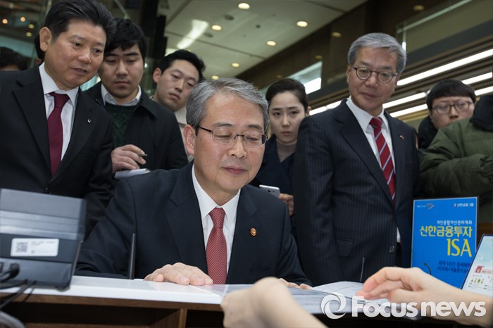 (서울=포커스뉴스) 15일 오후 서울 여의도 신한금융투자 본사 영업점에서 임종룡 금융위원장이 개인종합자산관리계좌(ISA) 가입을 위해 직원의 설명을 듣고 있다.
