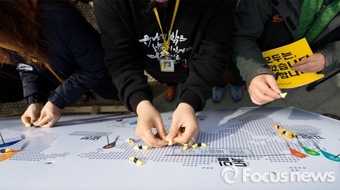 (서울=포커스뉴스) 15일 오후 서울 광화문광장에서 세월호 416가족협의회와 4.16연대가 세월호 700일 기획전시 개관식 및 2주기 추모의 달 공표 기자회견 후 지도에 리본을 달며 세월호 사고를 기억하자는 퍼포먼스를 하고 있다.