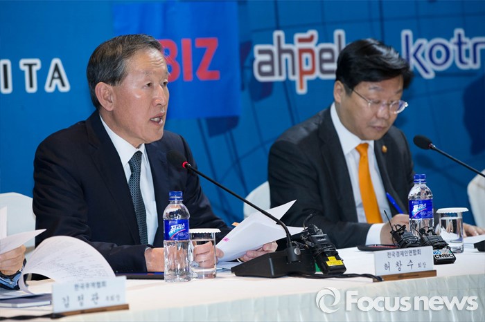 (서울=포커스뉴스) 허창수(왼쪽) 전국경제인연합회 회장이 15일 오후 서울 영등포구 전국경제인연합회관에서 열린 '해외진출 성과확산 토론회'에 참석해 인사말을 하고 있다.