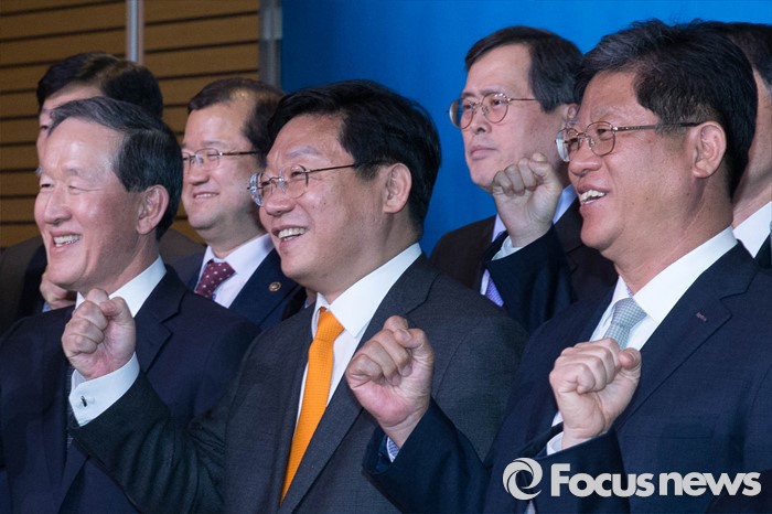 (서울=포커스뉴스) 15일 오후 서울 영등포구 전국경제인연합회관에서 열린 '해외진출 성과확산 토론회'에서 주형환(가운데) 산업통상자원부 장관, 허창수(왼쪽) 전국경제인연합회 회장, 김재홍(오른쪽) 대한무역투자진흥공사 사장 등을 비롯한 내빈들이 기념촬영을 하고 있다.