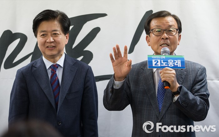 (서울=포커스뉴스) 원혜영 더불어민주당 의원(오른쪽)이 15일 오후 서울 마포구 백범로 노웅래 의원 선거사무소 개소식에 참석해 축사를 하고 있다.