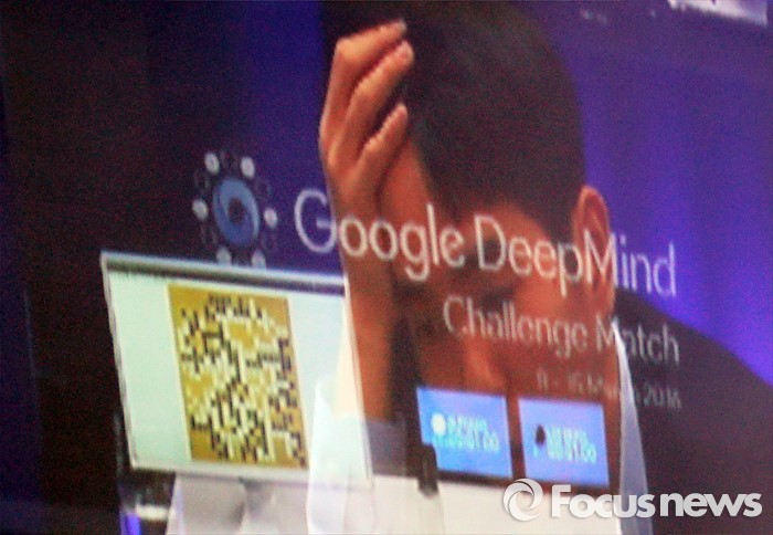 (서울=포커스뉴스) 15일 오후 서울 광화문 포시즌스 호텔에서 열린 구글 딥마인드 챌린지 매치 제5국에서 바둑기사 이세돌 9단이 인공지능 바둑프로그램 알파고에게 돌을 던진 뒤 생각에 잠긴 모습이 대국 해설장 화면에 비치고 있다.