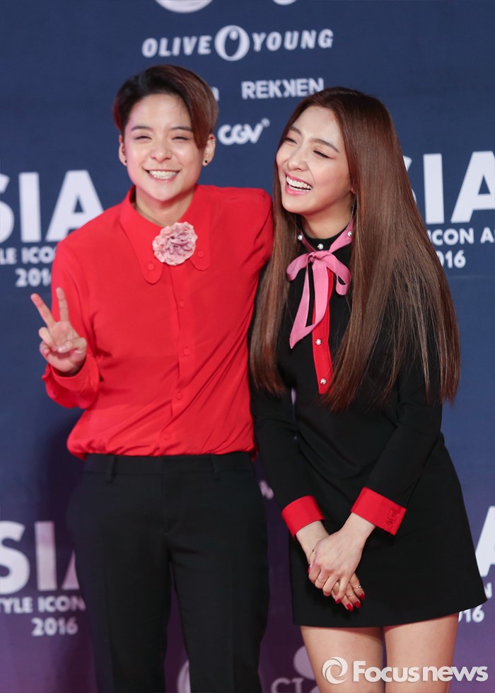 (서울=포커스뉴스) 15일 오후 서울 동대문구 동대문 디자인 플라자에서 열린 '스타일 아이콘 아시아 2016' 에 참석한 가수 엠버(왼쪽)와 루나가 포토타임을 갖고 있다.