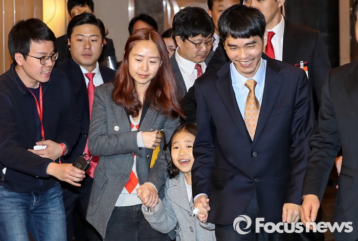 (서울=포커스뉴스) 15일 오후 서울 광화문 포시즌스 호텔에서 열린 구글 딥마인드 챌린지 매치 시상식을 마친 바둑기사 이세돌 9단(맨 오른쪽)이 아내 김현진 씨, 딸 혜림 양과 함께 발걸음을 옮기고 있다.