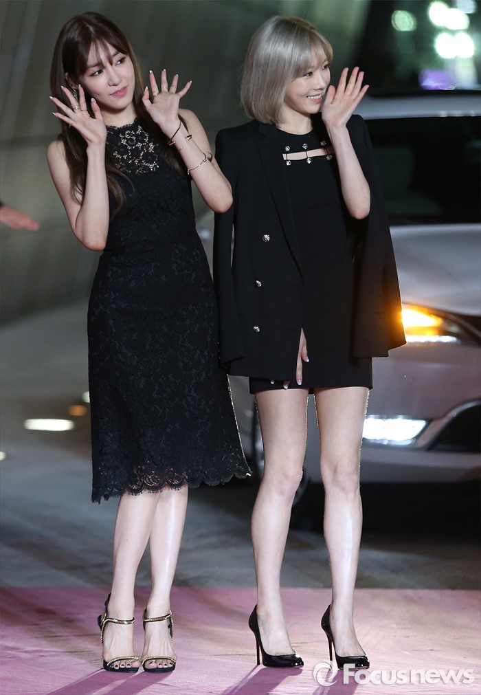 (서울=포커스뉴스) 15일 오후 서울 동대문구 동대문 디자인 플라자에서 열린 '스타일 아이콘 아시아 2016' 에 참석한 걸그룹 소녀시대의 멤버 티파니(왼쪽)와 태연이 손인사를 하고 있다.