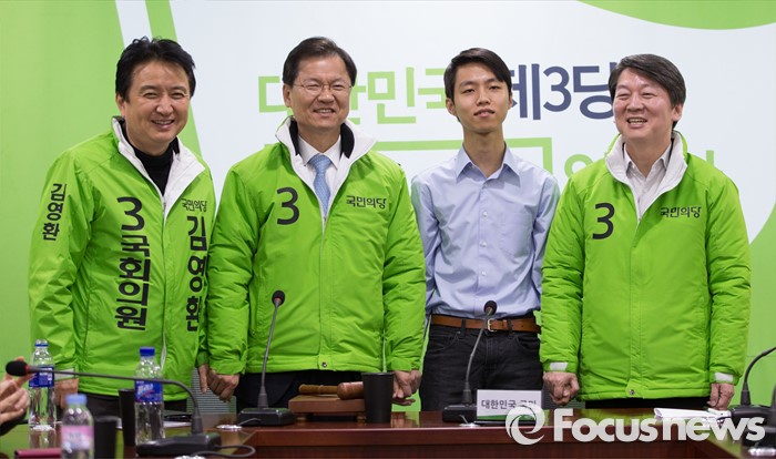 (서울=포커스뉴스) 안철수, 천정배 국민의당 상임공동대표가 16일 오전 서울 여의도 의원회관에서 열린 최고위원회의에서 국민대표와 함께 포토타임을 갖고 있다. 오른쪽 안 대표, 왼쪽부터 김영환 공동선대위원장, 천대표.