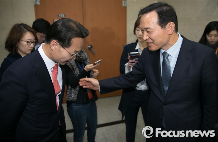(서울=포커스뉴스) 공천 배제(컷오프)된 조해진(왼쪽) 새누리당 의원이 16일 오전 서울 여의도 국회 정론관 앞에서 공천관리위원회 결정에 반발하는 내용의 기자회견을 마친 뒤 후보 공천에서 탈락해 기자회견을 앞둔 임태희 전 의원과 만나 대화하고 있다.