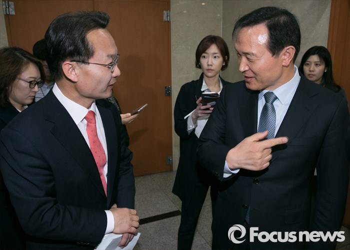 (서울=포커스뉴스) 공천 배제(컷오프)된 조해진(왼쪽) 새누리당 의원이 16일 오전 서울 여의도 국회 정론관 앞에서 공천관리위원회 결정에 반발하는 내용의 기자회견을 마친 뒤 후보 공천에서 탈락해 기자회견을 앞둔 임태희 전 의원과 만나 대화하고 있다.