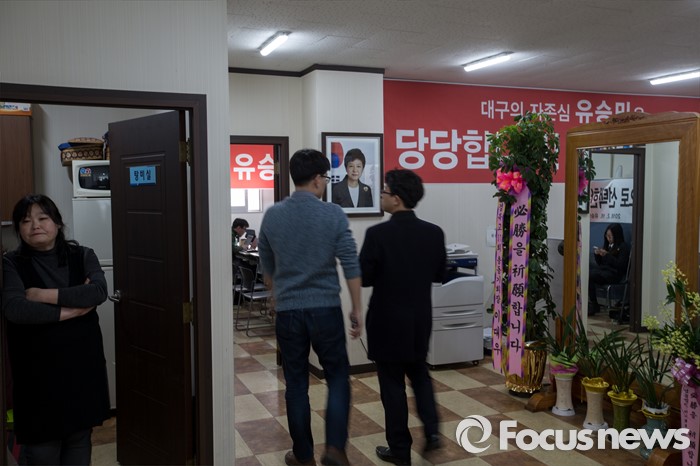 (대구=포커스뉴스) 새누리당이 유승민(대구 동구을) 의원에 대한 공천 배제안을 놓고 고민하고 있는 16일 오전 대구 동구 유 의원 선거사무소에 박근혜 대통령 사진이 걸려 있다.