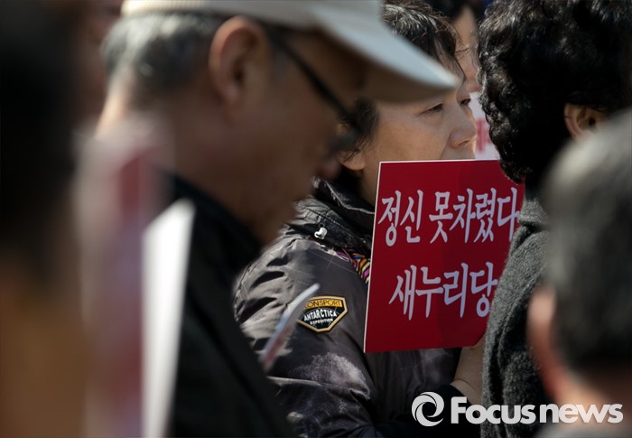 (서울=포커스뉴스) 16일 오전 서울 여의도 새누리당사 앞에서 공천 배제(컷오프)된 이재오 의원의 지지자들이 공천관리위원회의 결정 철회를 촉구하는 집회를 하고 있다.