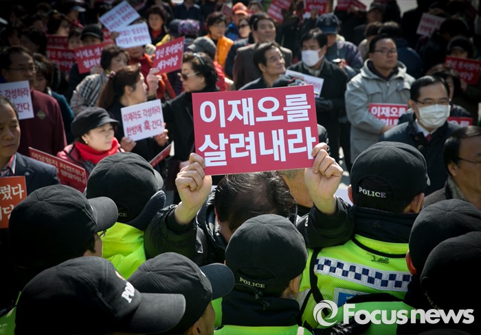(서울=포커스뉴스) 16일 오전 서울 여의도 새누리당사 앞에서 공천 배제(컷오프)된 이재오 의원의 지지자들이 공천관리위원회의 결정 철회를 촉구하는 집회를 하고 있다.
