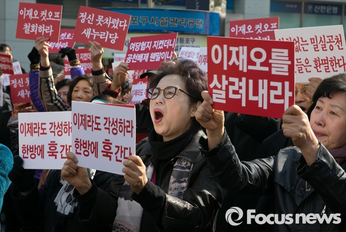 (서울=포커스뉴스) 16일 오전 서울 여의도 새누리당사 앞에서 공천 배제(컷오프)된 이재오 의원의 지지자들이 공천관리위원회의 결정 철회를 촉구하는 집회를 하고 있다.