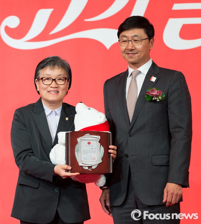 (서울=포커스뉴스) 16일 오전 서울 중구 더플라자호텔 그랜드볼룸에서 제21회 코카콜라 체육대상 시상식에 참석한이에리사(왼쪽) 새누리당 의원이 공로상을 수상하고 있다. 오른쪽은 이창엽 코카콜라 대표이사.