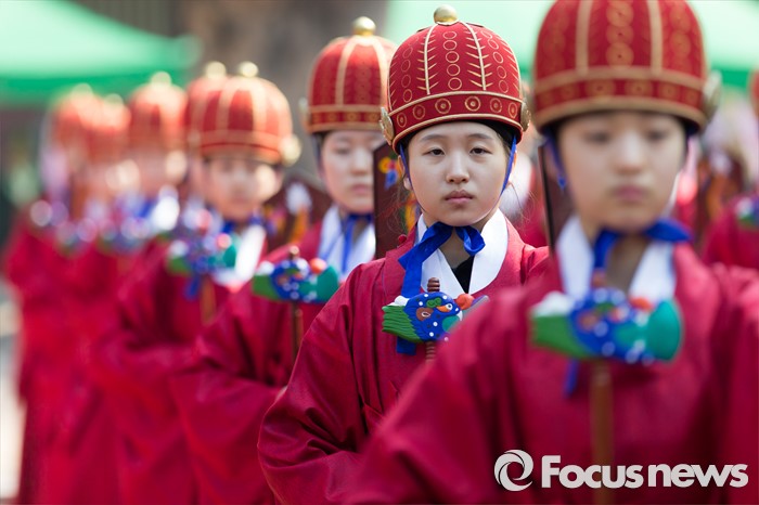 (서울=포커스뉴스) 16일 오전 서울 종로구 성균관 대성전에서 열린 '2016 춘기석전대제'에서 일무보존회 회원들이 일무를 추고 있다.