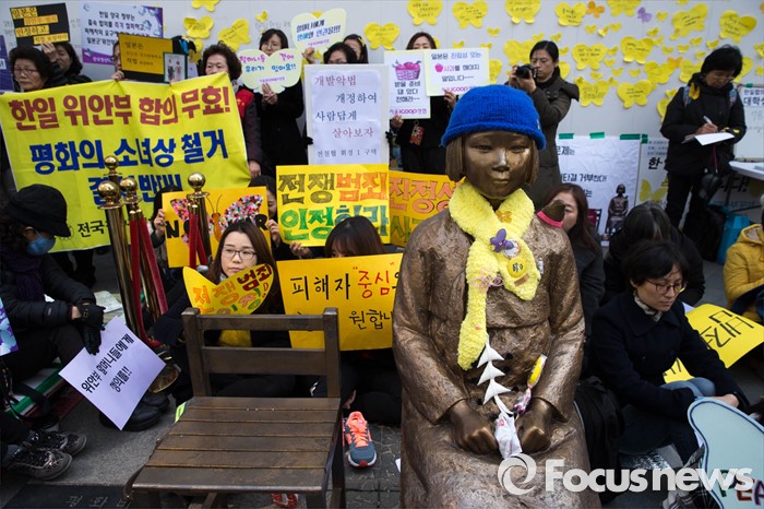 (서울=포커스뉴스) 16일 오후 서울 종로구 옛 일본 대사관 앞에서 '일본군 위안부 문제해결을 위한 1222차 정기 수요집회'가 열리고 있다.