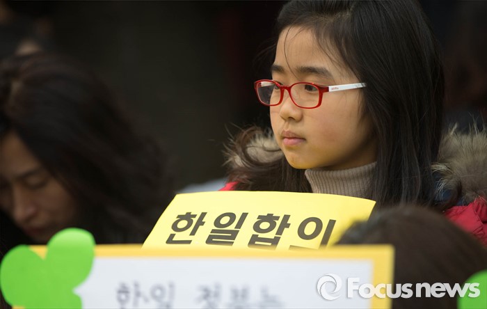 (서울=포커스뉴스) 16일 오후 서울 종로구 옛 일본 대사관 앞에서 열린 제 1222차 정기 수요집회에서 한 어린이가 위안부 문제 한일 합의 전면무효를 촉구하는 손피켓을 들고 있다.