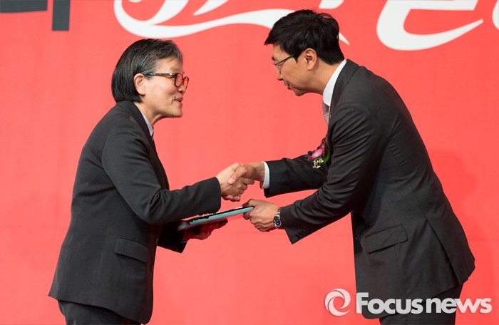 (서울=포커스뉴스) 16일 오전 서울 중구 더플라자호텔 그랜드볼룸에서 제21회 코카콜라 체육대상 시상식에 참석한이에리사(왼쪽) 새누리당 의원이 공로상을 수상하고 있다.