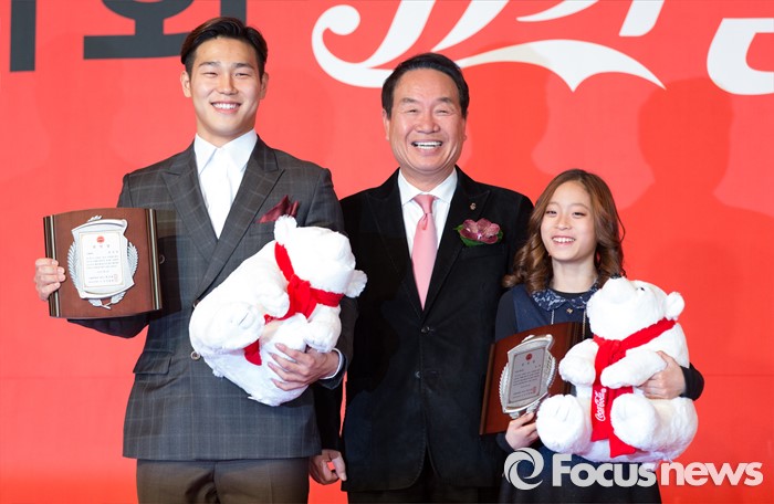 (서울=포커스뉴스) 16일 오전 서울 중구 더플라자호텔 그랜드볼룸에서 제21회 코카콜라 체육대상 시상식에 참석한 스켈레톤 대표 윤성빈(왼쪽)과 피겨스케이팅 대표 유영(오른쪽)이 신인상 수상 후 기념촬영을 하고 있다. 가운데는 김성일 대한장애인체육회장.
