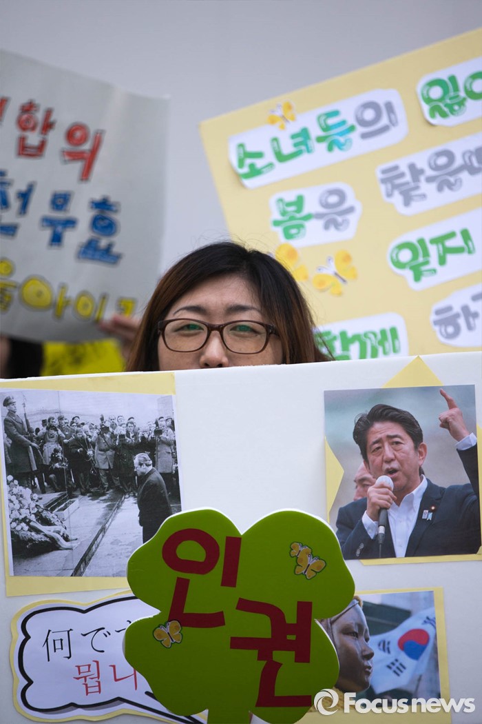 (서울=포커스뉴스) 16일 오후 서울 종로구 옛 일본 대사관 앞에서 '일본군 위안부 문제해결을 위한 1222차 정기 수요집회'가 열린 가운데 한 시민이 위안부 한일 협정을 반대하는 손피켓을 들고 있다.