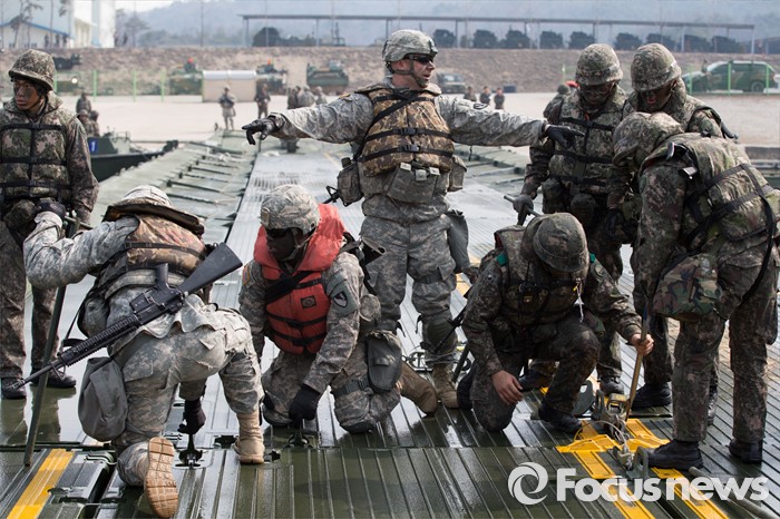 (이천=포커스뉴스) 16일 오전 경기도 이천시 7공병여단 도하훈련장에서 열린 '한·미 연합 소부대 도하훈련'에서 한국군 제7공병여단 도하대대와 미군 제2전투항공여단 공병대대 장병들이 부교를 설치하고 있다.