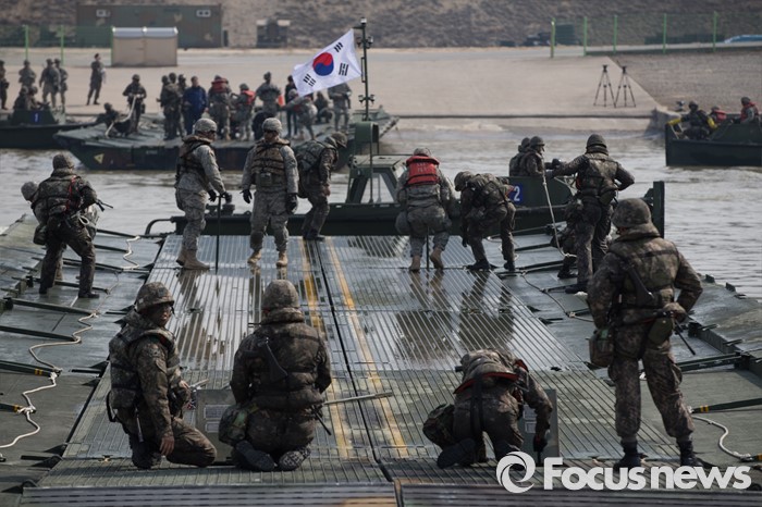 (이천=포커스뉴스) 16일 오전 경기도 이천시 7공병여단 도하훈련장에서 열린 '한·미 연합 소부대 도하훈련'에서 한국군 제7공병여단 도하대대와 미군 제2전투항공여단 공병대대 장병들이 부교를 설치하고 있다.