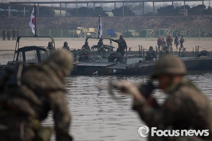 (이천=포커스뉴스) 16일 오전 경기도 이천시 7공병여단 도하훈련장에서 열린 '한·미 연합 소부대 도하훈련'에서 한국군 제7공병여단 도하대대 장병들이 부교를 설치를 위해 경계 근무를 서고 있다.