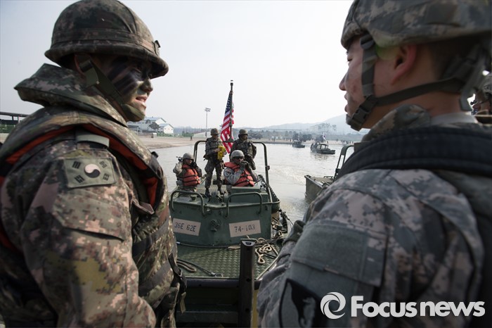 (이천=포커스뉴스) 16일 오전 경기도 이천시 7공병여단 도하훈련장에서 한국군 제7공병여단 도하대대와 미군 제2전투항공여단 공병대대 장병들이 한미 연합 도하훈련 준비를 하고 있다.
