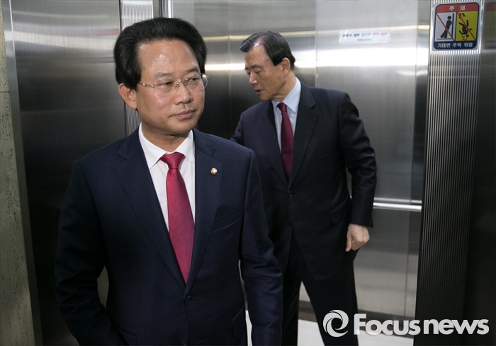 (서울=포커스뉴스) 공천 배제(컷오프)된 류성걸(왼쪽) 새누리당 의원이 16일 오후 서울 여의도 당사에서 공천관리위원회의에 참석하는 이한구 위원장을 기다리기 위해 홍문표 위원이 탄 승강기를 올려보내고 있다.