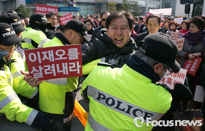 "성명서 전달할 때까지 못 간다" "내일까지 안 갈 것"이라며 자리를 뜨지 않던 이들은 한 시간여 후에 자진 해산했다.16일 오전 서울 여의도 새누리당사 앞에서 열린 공천 배제(컷오프)된 이재오 의원의 공천관리위원회의 결정 철회를 촉구하는 지지자들의 집회에 참가한 한 지지자가 경찰과 승강이를 벌이고 있다. 2016.03.16 박동욱 기자