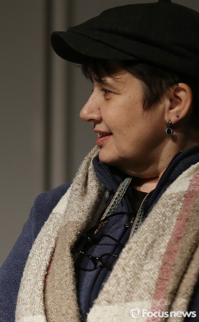 (서울=포커스뉴스) 16일 오후 서울 종로구 미마지아트센터 눈빛극장에서 열린 연극 '두 코리아의 통일' 프레스콜에 참석한 까띠 라뺑 연출이 진행자에게 질문을 받고 있다.