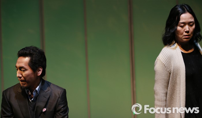 (서울=포커스뉴스) 16일 오후 서울 종로구 미마지아트센터 눈빛극장에서 열린 연극 '두 코리아의 통일' 프레스콜에 참석한 배우 전중용과 박현미가 주요장면을 시연하고 있다.