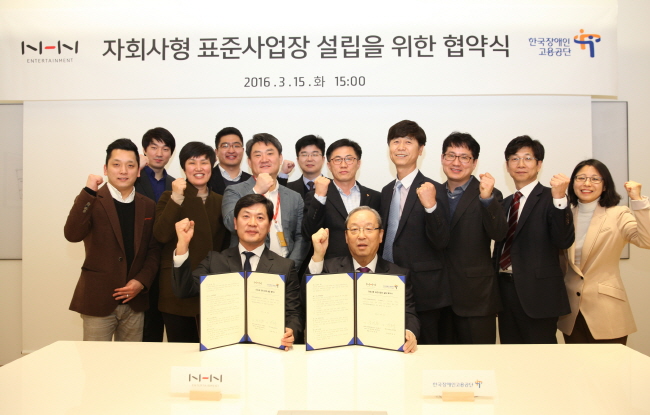 박승규 한국장애인고용공단 이사장 역시 "성장 가능성이 높은 온라인 서비스 업종의 대기업들에게 장애인 고용의 모범사례가 될 수 있도록 NHN엔터테인먼트의 자회사형 표준사업장 설립에 모든 역량을 집중해 지원하겠다"고 약속했다.사진은 NHN엔터 자회사형 장애인 표준사업장 협약식 <사진제공=NHN엔터>