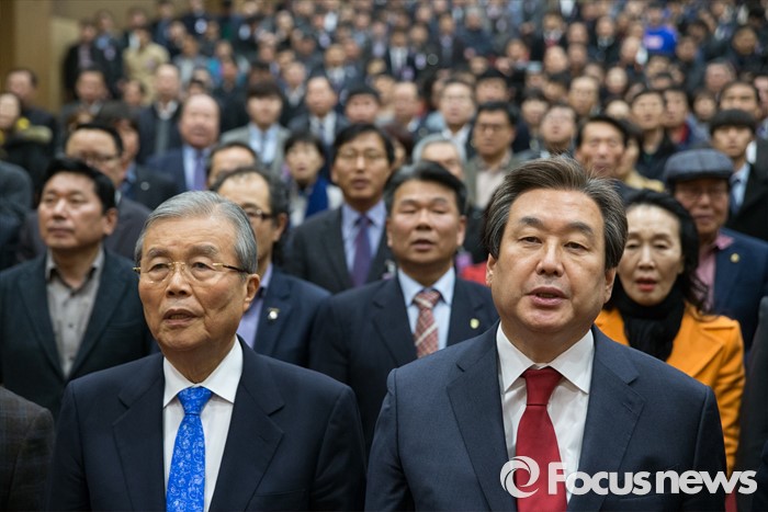 (서울=포커스뉴스) 김무성 새누리당 대표(오른쪽)와 김종인 더불어민주당 대표가 16일 오후 서울 여의도 국회 의원회관에서 열린 '자영업자 정책연대 및 생존권 사수 출정식'에 참석해 애국가를 부르고 있다.