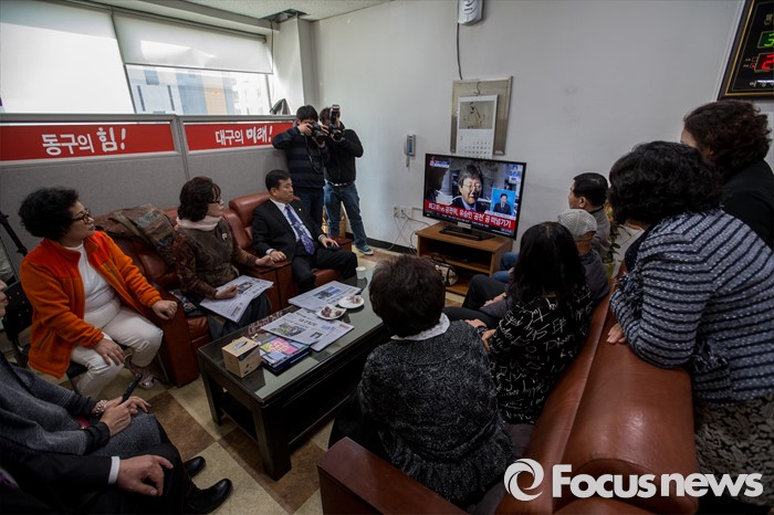 (대구=포커스뉴스) 새누리당이 유승민(대구 동구을) 의원에 대한 공천 배제안을 놓고 고민하고 있는 16일 오후 대구 동구 유 의원 선거사무소에 모인 지지자들이 뉴스를 시청 하고 있다.
