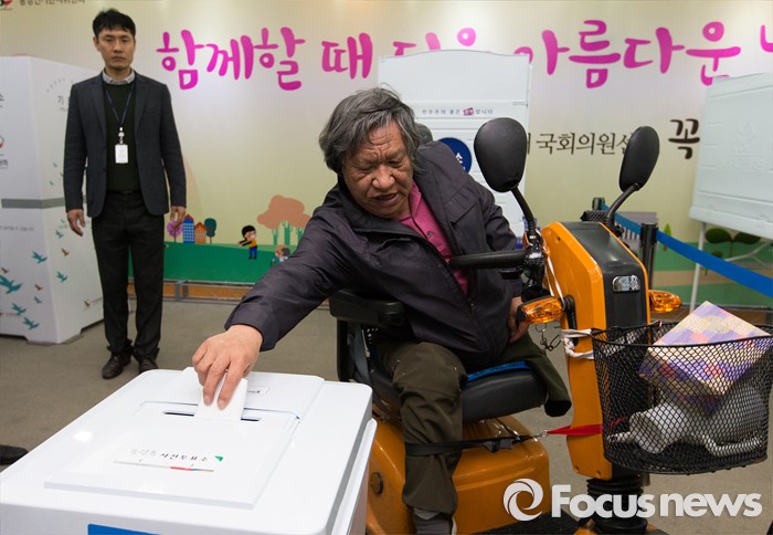 (서울=포커스뉴스) 16일 오후 서울 영등포구 이룸센터에서 열린 '20대 총선 거동불편유권자 대상 사전투표 모의 체험행사'에 참석한 장애인 유권자가 투표함에 투표지를 넣고 있다.