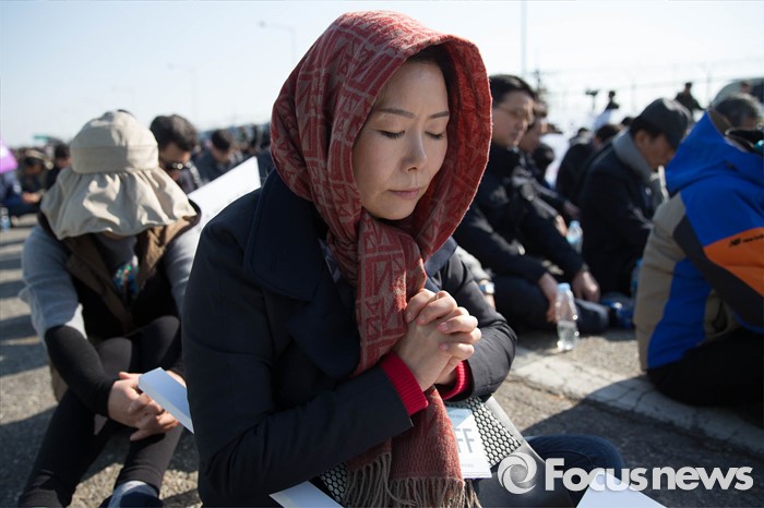 (파주=포커스뉴스) 16일 오후 경기도 파주시 통일대교에서 개성공단 입주기업, 영업기업, 협력기업 등 대표를 비롯한 임직원과 가족들이 공단재가동 및 실질보상을 촉구하며 '개성공단 평화대행진 집회'를 하고 있다.