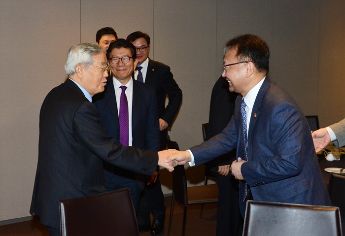 | △ 김기환 회장과 악수하는 유일호 부총리 |