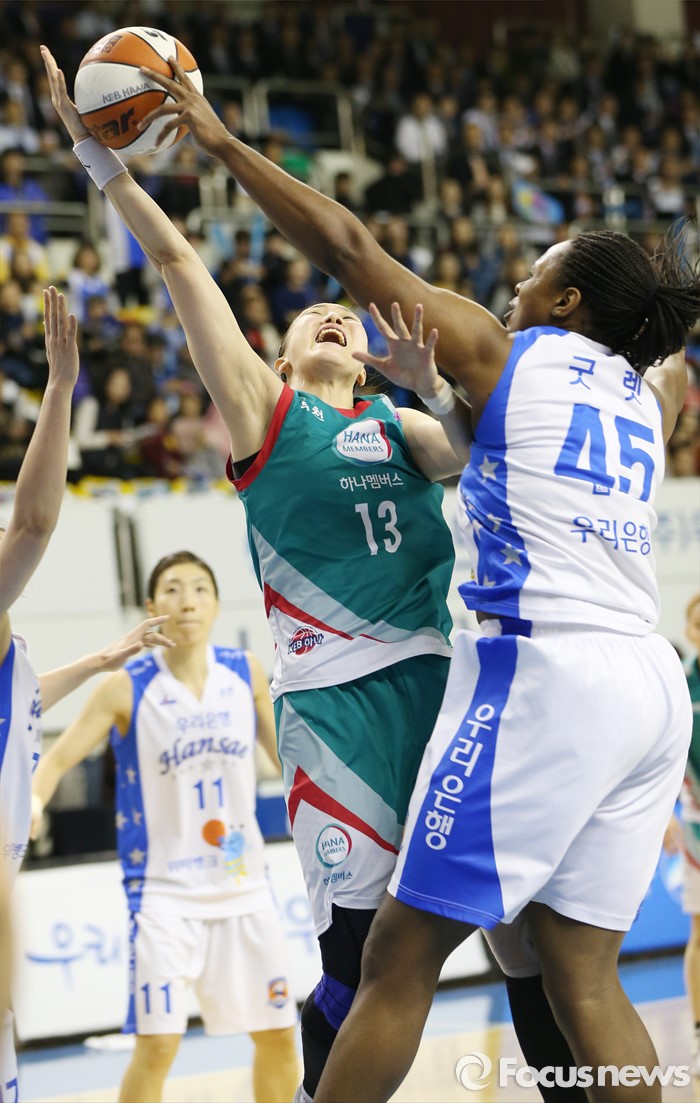 (춘천=포커스뉴스) 춘천호반체육관에서 열린 2015~2016 여자프로농구 우리은행-KEB하나 챔피언결정전 1차전에서 우리은행 굿렛이 KEB하나 김정은의 레이업슛을 블록하고 있다.