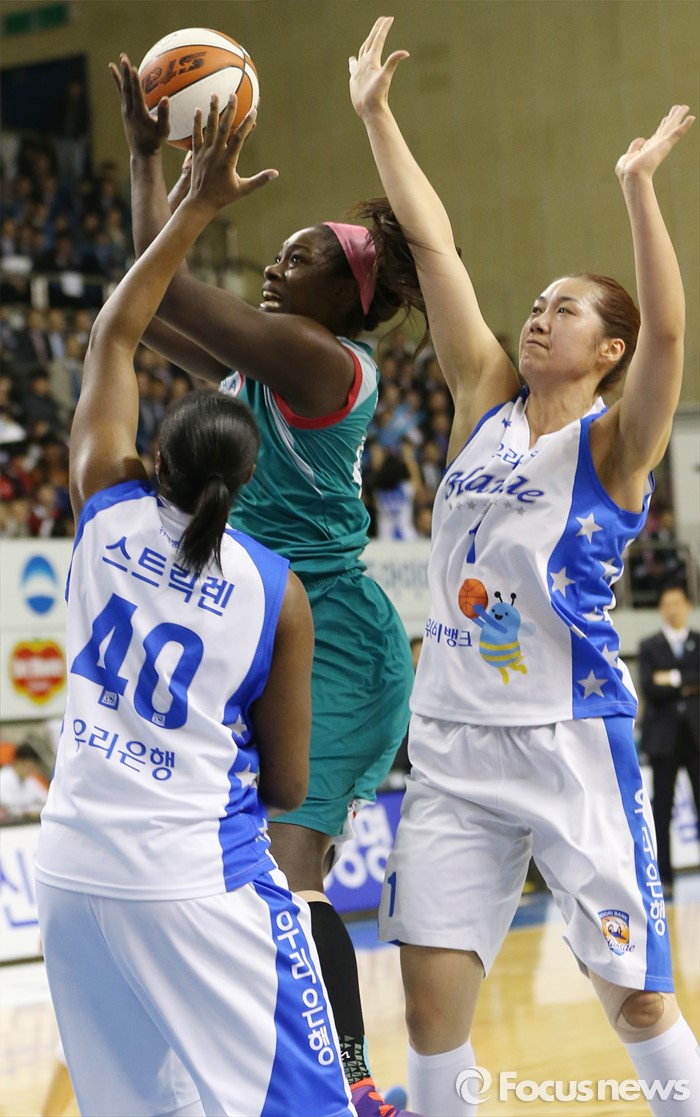 (춘천=포커스뉴스) 춘천호반체육관에서 열린 2015~2016 여자프로농구 우리은행-KEB하나 챔피언결정전 1차전에서 KEB하나 첼시 리가 우리은행 스트릭렌과 양지희의 마크를 뚫고 점프슛을 시도하고 있다.