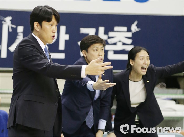 (춘천=포커스뉴스) 춘천호반체육관에서 열린 2015~2016 여자프로농구 우리은행-KEB하나 챔피언결정전 1차전에서 우리은행 위성우 감독과 박성배, 전주원 코치가 이구동성으로 선수들을 독려하고 있다.