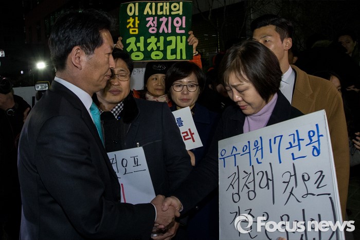 (서울=포커스뉴스) 20대 총선에서 공천배제된 정청래 더불어민주당 의원이 16일 오후 서울 여의도 당사 앞에서 기자회견을 가진 후 한 지지자와 악수하고 있다.