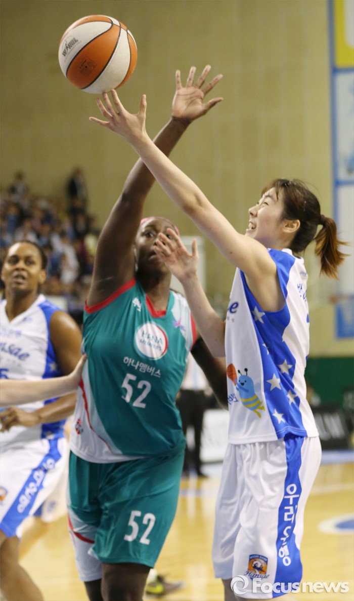 (춘천=포커스뉴스) 춘천호반체육관에서 열린 2015~2016 여자프로농구 우리은행-KEB하나 챔피언결정전 1차전에서 우리은행 박혜진이 KEB하나 첼시 리의 블록을 피해 레이업슛을 쏘고 있다.