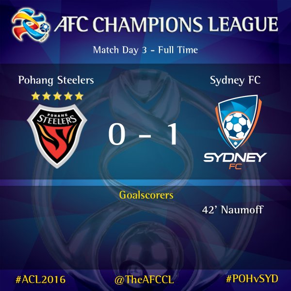 포항은 이날 패배로 1승1무1패(승점 4)를 기록하며 2위에 머물렀다. 반면 시드니는 2승1패(승점 6)으로 조 1위로 올라섰다. 포항의 순위는 광저우 에버그란데와 우라와 레즈간의 경기 결과에 따라 더 내려갈 가능성도 있다.프로축구 포항이 16일 경북 포항 스틸야드에서 열린 호주 시드니FC와의 2016 아시아축구연맹(AFC) 챔피언스리그 조별라운드 G조 3라운드 홈경기에서 0-1로 패했다. <사진출처=아시아축구연맹(AFC) 공식 트위터>