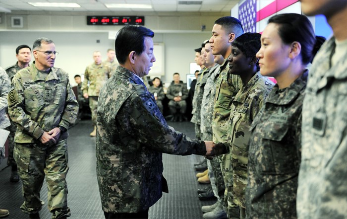 (서울=포커스뉴스) 한민구 국방부 장관이 16일 키리졸브(KR) 연습이 진행중인 한·미연합군사령부 훈련장을 방문, 연습에 전념하고 있는 장병들을 격려하고 있다. <사진제공=국방부>