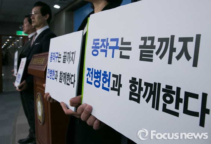 (서울=포커스뉴스) 공천 배제(컷오프)된 전병헌 더불어민주당 의원의 지역위원회 당원들이 17일 오전 서울 여의도 국회 정론관에서 전 의원을 지지하는 기자회견을 하고 있다.