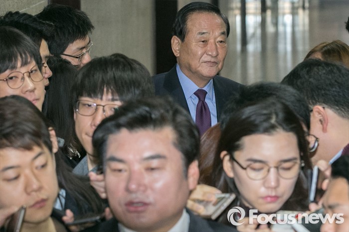 (서울=포커스뉴스) 원유철(앞) 새누리당 원내대표가 17일 오전 서울 여의도 국회에서 열린 최고위원회 간담회에 참석하며, 기자들의 질문에 답변하는 동안, 서청원(뒤) 최고위원이 바라보고 있다. 김무성 대표가 불참한 이날 새누리당 최고위 간담회에서는 원유철 원내대표와 일부 최고위원들이 참석해, 공천관리위원회의 의결과 관련해 논의하는 것으로 알려졌다.