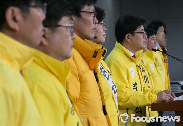 (서울=포커스뉴스) 박원석(왼쪽 다섯번째) 정의당 경기도당위원장과 예비후보들이 17일 오전 서울 여의도 국회 정론관에서 야권연대 관련 기자회견을 하고 있다.